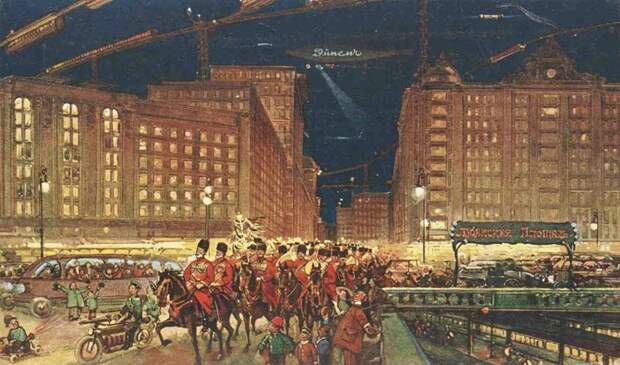 Лубянская площадь. Ясный вечер с светящимися самолетами, дирижаблями и вагонами воздушной дороги.