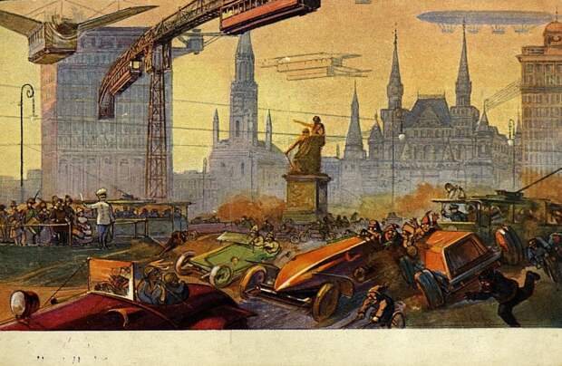 Открытки изображали Москву через 200–300 лет (конкретно упоминается 2259 год), в эпоху технологического прогресса: с летающими аппаратами, монорельсами, дирижаблями, метро и другими инновациями. Однако одежда людей оставалась старомодной, похожей на начало XX века, а военная форма — традиционной русской. Серия вышла незадолго до Первой мировой войны и отражала оптимистичный взгляд на будущее: мир без войн, коммерческий флот вместо военного, чистый воздух. На оборотной стороне каждой открытки был текст с описанием сюжета.