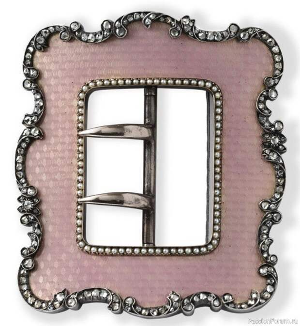 Пряжка из серебра и золота, мастер Август Хольминг, фирма Фаберже, эмаль по гильошированному фону, жемчуг, бриллианты, Санкт-Петербург, 1899-1908 гг.