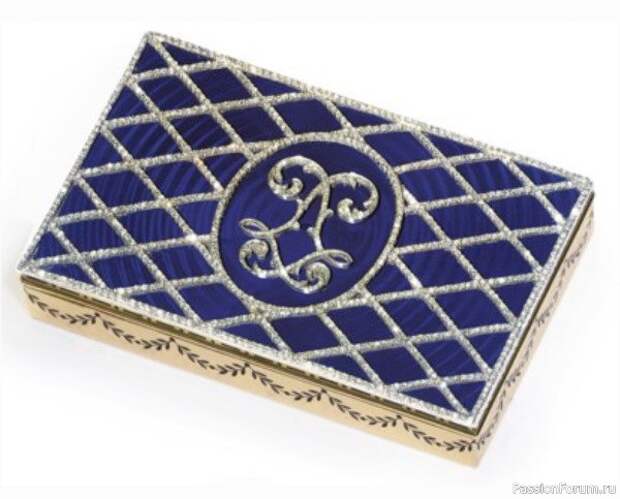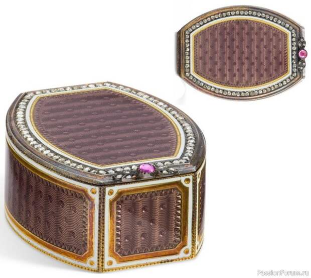 Золотая бонбоньерка, украшенная гильошированной эмалью и драгоценными камнями, длина 4,2 см, мастер Михаил Перхин, фирма Фаберже, Санкт-Петербург, 1899-1903 гг.