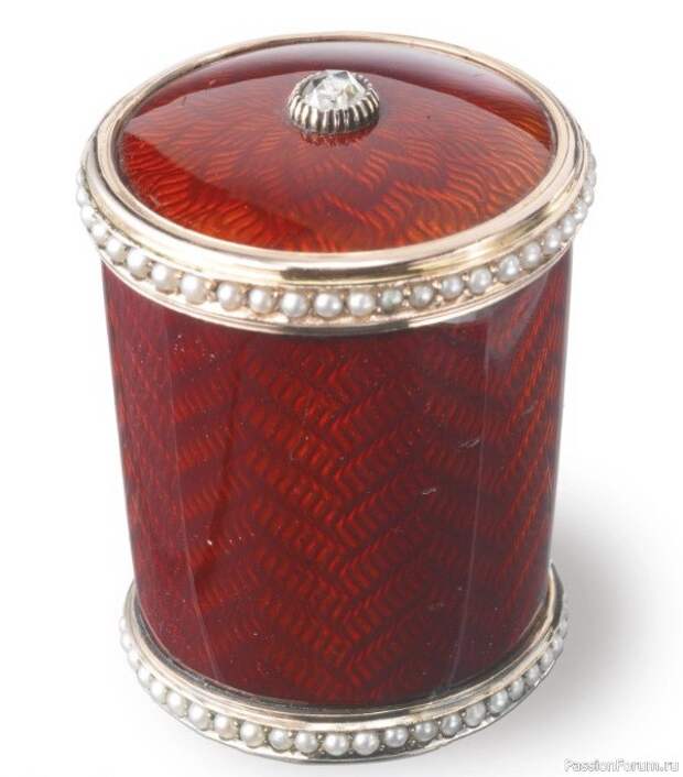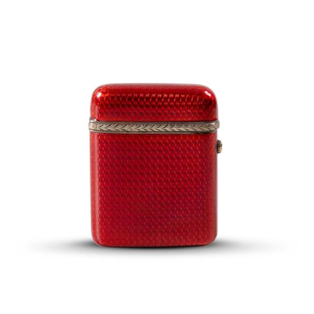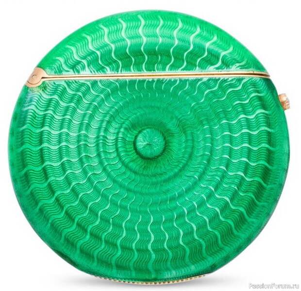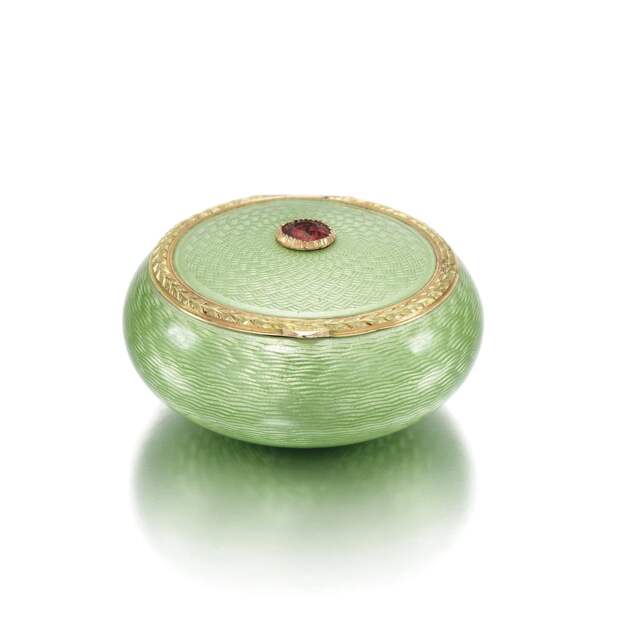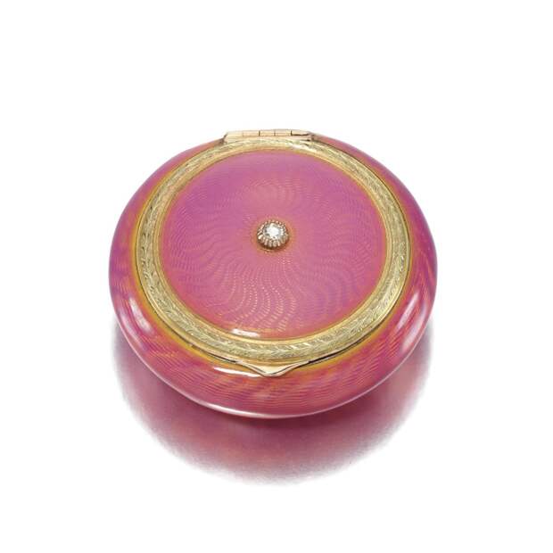 Золотая спичечница, украшенная гильошированной эмалью и бриллиантами, диаметр 4,5 см, мастерская Анны Ринге, фирма Фаберже, Санкт-Петербург, 1899-1903 гг.