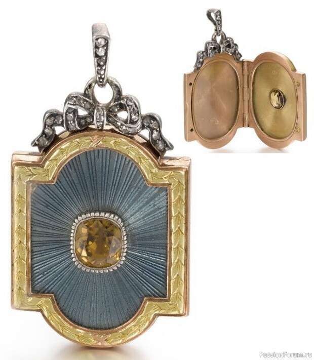 Золотой медальон, украшенный гильошированной эмалью, цитрином и бриллиантами, мастер Август Хольминг, фирма Фаберже, Санкт-Петербург, 1899-1903 гг.