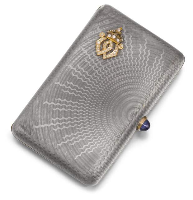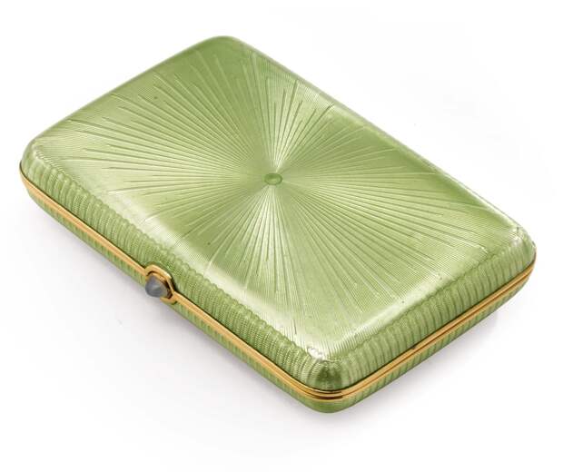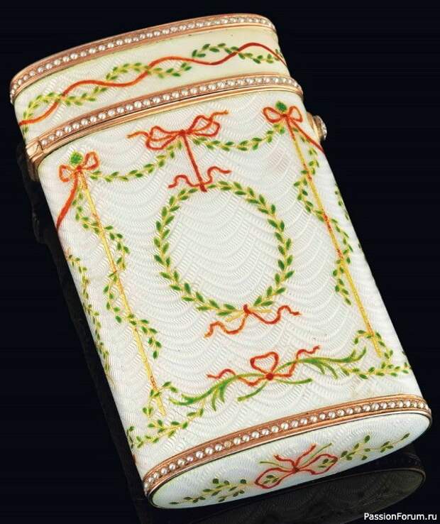 Золотой портсигар, украшенный гильошированной эмалью, эмалевыми гирляндами и драгоценными камнями, длина 8,3 см, мастер Михаил Перхин, фирма Фаберже, Санкт-Петербург, 1899-1903 гг.