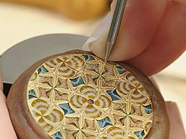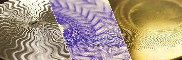Они наносятся с помощью специальной насадки гильоше, под которой станок медленно вращая заготовку гравирует рисунок. Накладывая друг на друга граверную сеть, получают комбинированный сложный орнамент.
