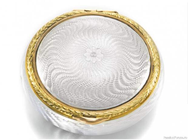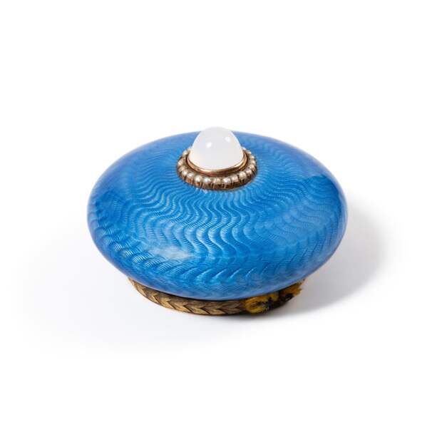 Таблетница из серебра и золота, украшенная бледно-голубоватой гильошированной эмалью, мастер Хенрик Вигстрём, фирма Фаберже, Москва, Санкт-Петербург, 1903-1904 гг.