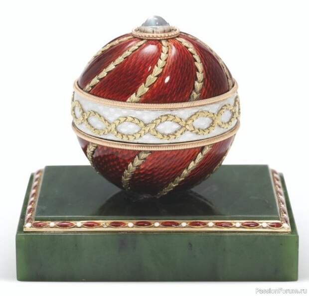 Кнопка звонка в виде золотого шара, украшенного гильошированной эмалью, на нефритовой подставке, кнопка из лунного камня, длина 6,6 см, фирма Фаберже, Санкт-Петербург, около 1900 г.