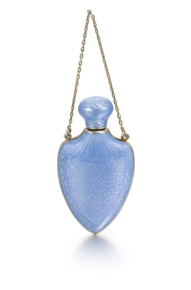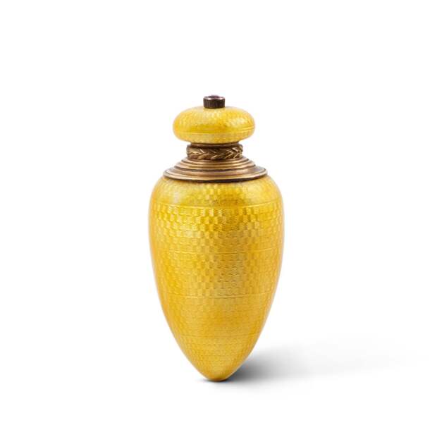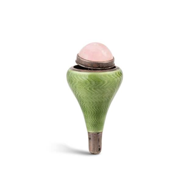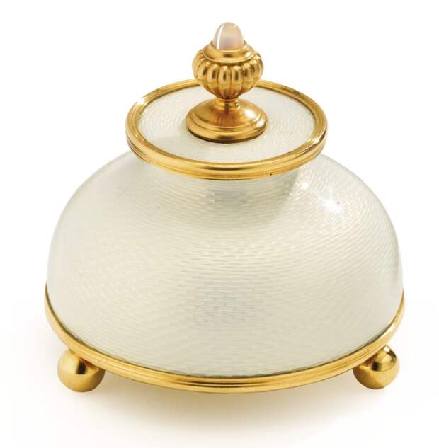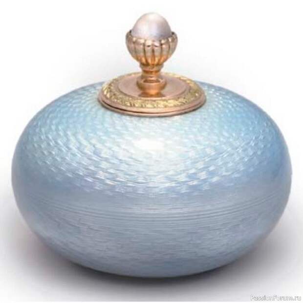 Золотой флакон для клея, украшенный гильошированной эмалью, со съемной кисточкой, увенчанной лунным камнем, диаметр 4,5 см, мастер Хенрик Вигстрём, фирма Фаберже, Санкт-Петербург, 1896-1908 гг.