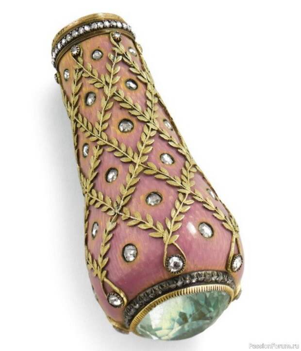 Ручка зонтика из золота и серебра, украшенная клубничной гильошированной эмалью, жемчугом и бриллиантом, мастер Михаил Перхин, фирма Фаберже, Санкт-Петербург, 1899-1903 гг.
