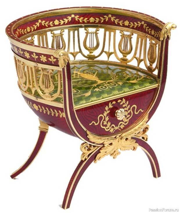 Золотая бонбоньерка в форме fauteuil en gondole Французской Империи, украшенная гильошированной эмалью, высота 5,5 см, мастер Михаил Перхин, фирма Фаберже, Санкт-Петербург, 1899-1903 гг.