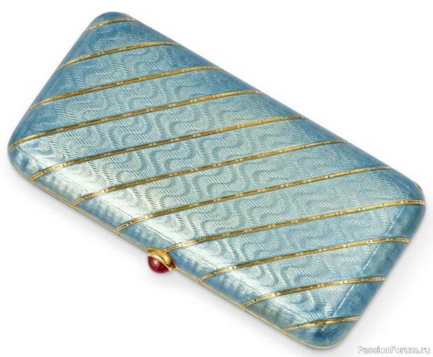 Золотой портсигар с рубиновой кнопкой и эмалью по гильошированному фону, длина 8 см, фирма Фаберже, Москва, 1899-1908 гг.