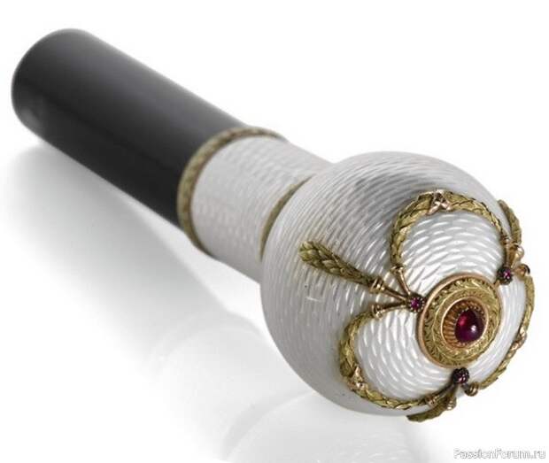 Ручка зонтика из золота и серебра, украшенная гильошированной эмалью, аметистами и рубином, мастер Михаил Перхин, фирма Фаберже, Санкт-Петербург, около 1895 г.