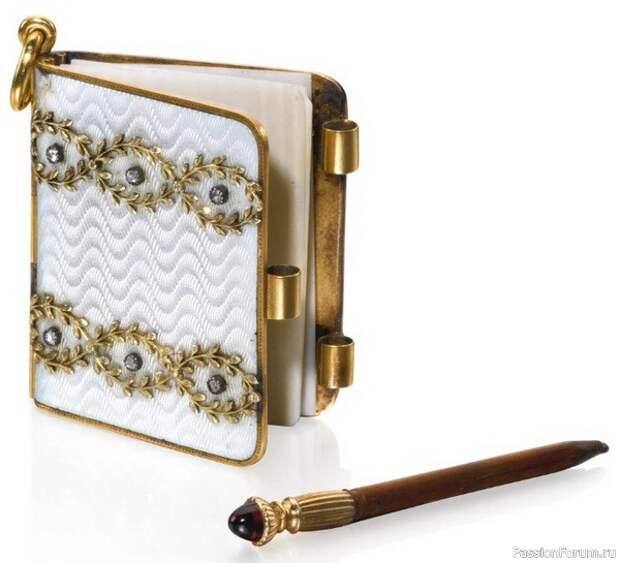 Записная книжка из золота и серебра со страничками из слоновой кости, украшенная гильошированной эмалью и бриллиантами, фирма Фаберже, Москва, 1899–1908 гг.