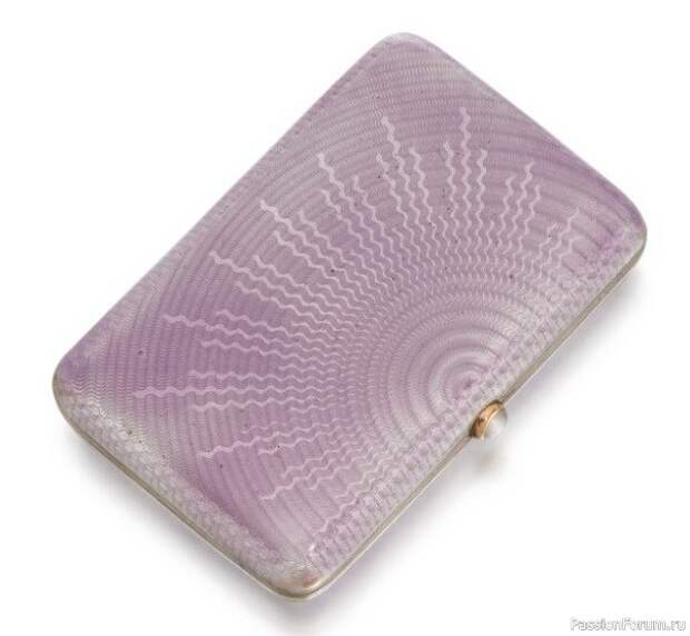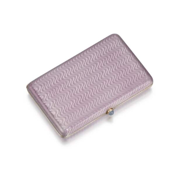 Золотой портсигар, украшенный гильошированной эмалью лавандового цвета, с кнопкой из лунного камня, длина 8,5 см, мастер Андерс Невалайнен, фирма Фаберже, Санкт-Петербург, 1899-1908 гг.