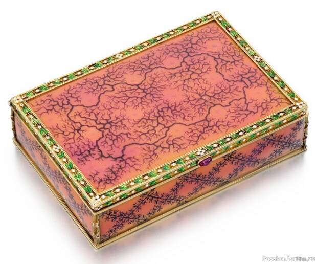Золотая шкатулка, фирма Фаберже, эмаль по гильошированному фону с имитацией рисунка дендритового агата, Москва, 1899-1908 гг.