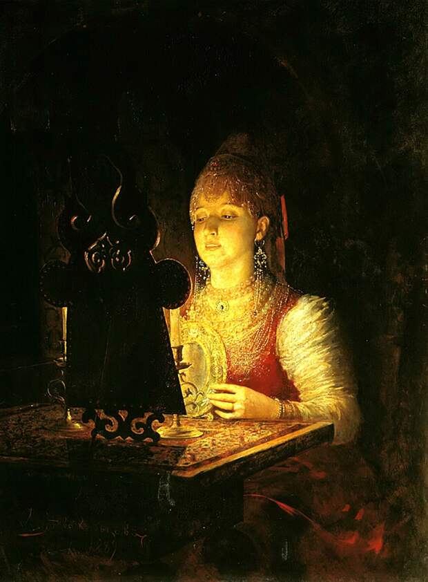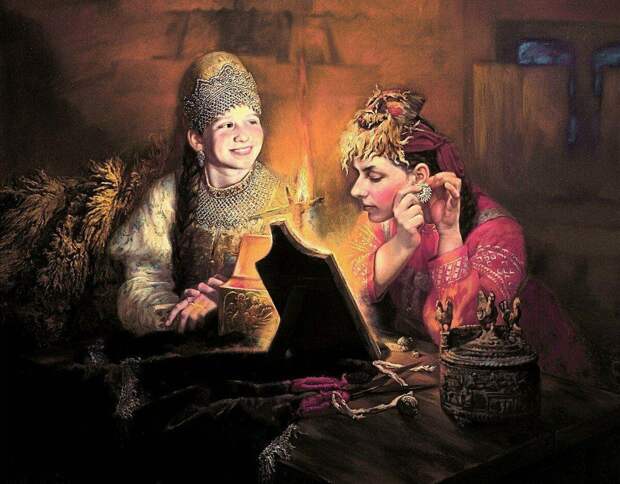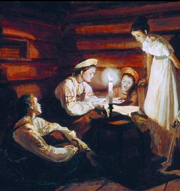 Например, посмотрите на картину в иллюстрации. Называется она - Гадающая Светлана. 1836. Автор - Карл Брюллов. Это единственное произведение художника, написанное на тему русской национальной традиции. И вдохновлялся Брюллов балладой Василия Жуковского «Светлана» (если не читали, то сейчас самое время!).
