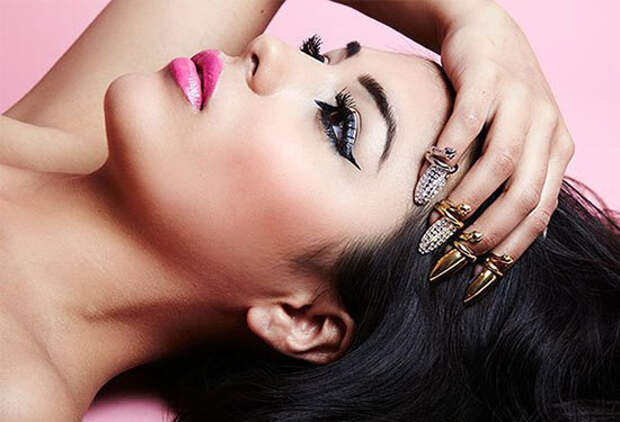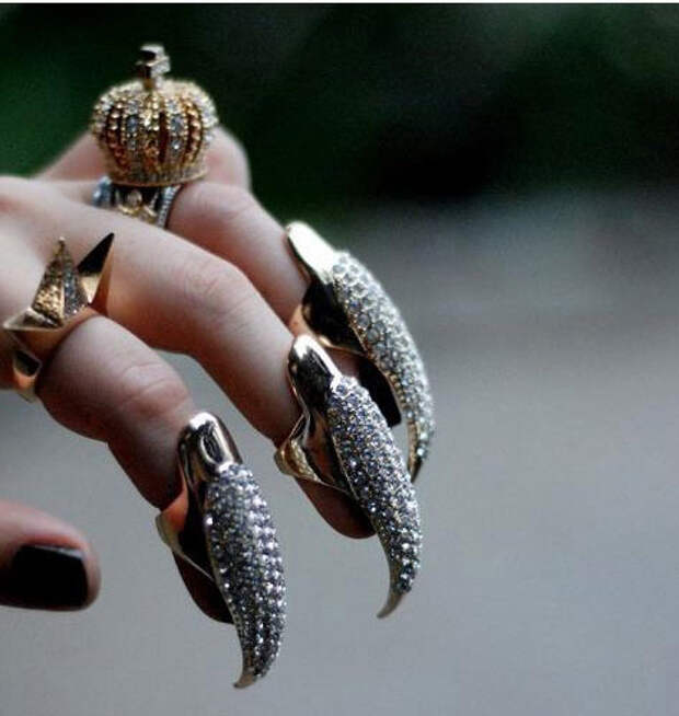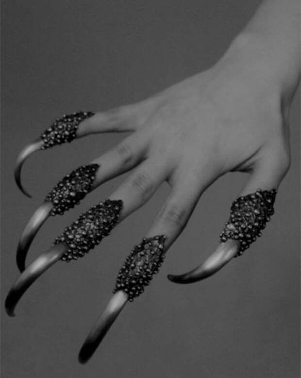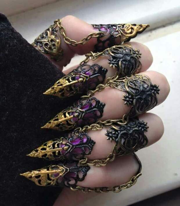 Это обычные кольца, а также ювелирные "наперстки", прикрепляемые цепочками к браслетам. Индийские невесты носят их на руках, расписанных хной, потрясающе! Видимо, эта мода проникла к белым детям через хиппи и нью-эйдж.Попробуем копнуть глубже. У кого были когти-ногти? Конечно у воображаемых вампиров.«Крестная мать готов» — секс-символ 1910-х годов.