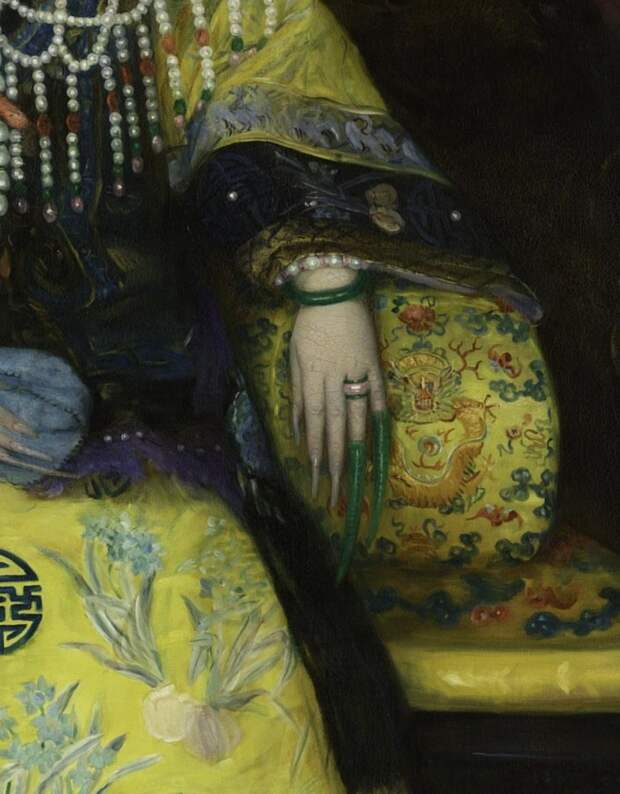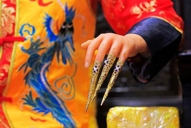 У китайских аристократок отросшие до неимоверной длины ногти были важным атрибутом их высокого социального статуса, поскольку это ассоциировалось с хищными птицами, т.е. находящимися на вершине пищевой цепочки крылатых. Но даже если ты не моешь посуду и не печатаешь на клавиатуре,образно выражаешь, просто ходить по комнате с такими ногтями неудобно, длинные ногти очень хрупки. Так были изобретены металлические футляры для ногтей хучжи.