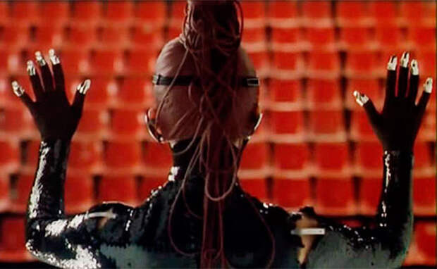 Кадр из фильма Альмодовара "Кика" (1993), где Готье выступил дизайнером образа одной актисы - Виктории Абриль, сыгавшей роль телеведущей программы "Ужасы дня" Андреа.