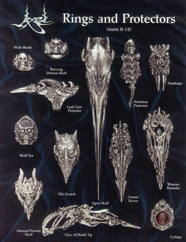 Мода на тяжелые серебряные перстни (как и на кожаные косухи) была взята рок-культурой у байкеров еще в 1950-е. Судя по фото музыкантов 1970-х, тогда эти кольца еще не изобрели. Видимо, это произошло в следующем десятилетии. Наверняка изначальный дизайнер перстней, чье имя утеряно, также любил дешевые фильмы жанра "sword and sorcery", которых так много было сделано в 1980-е, с сексуальными злодеями в доспехах (этот же стиль орнаментики мы видим в дизайне назгулов в фильмах "Властелин колец").