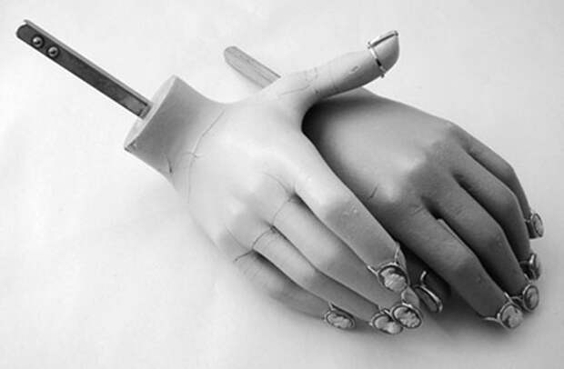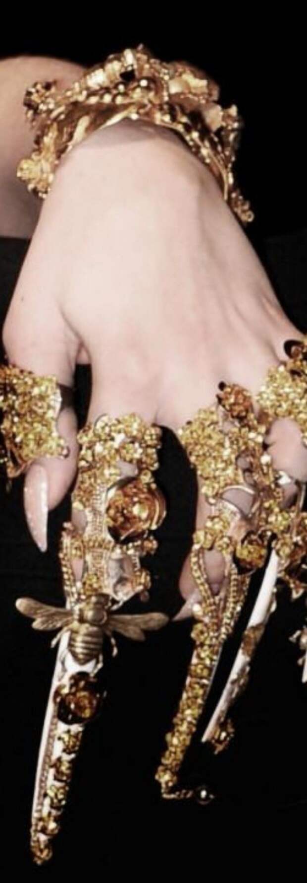 Такого типа украшения я бы отнесла, в определенной степени, к украшениям "по Фрейду". У многих в душе оставил след образ Фредди Крюгера и с появлением новой моды появилась возможность расквитаться с ним за пережитые страхи. Вообще в кольцах-ногтях много театральности, включения в игру. Вместе с тем, новая мода вызвала появление принципиально нового подхода к созданию украшений. Раньше ювелирное искусство существовало в рамках определенных традиций, а стиль и вкус определялись лишь способностью сочетать украшения с одеждой и с другими аксессуарами. Cейчас сама рука становится объектом дизайна и хотя рука остается частью общего образа, она одновременно и сама становится образом более сложным и самостоятельным. Сам живой человек все больше становится объектом дизайна - каждый становится сам себе дизайнером самого себя, выражает свое настроение и состояние, создает свой образ. Вспомним, язык украшений - это тайный магический язык-шифр.