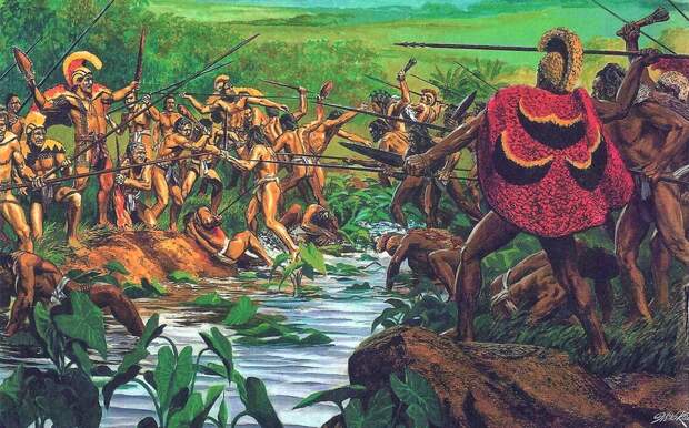 Шлем с гребнем из перьев птиц назывался махиоле и считался символом высшего правящего класса, а носить такой головной убор разрешалось только вместе с плащом-туникой. Удивительно, но воины гавайского племени коа, как и эллины, сражались тесной фалангой и вооружившись длинными копьями. На фоне таких совпадений возникла теория, согласно которой флот Неарха или его часть все-таки доплыли до Полинезии и покорили местное население.