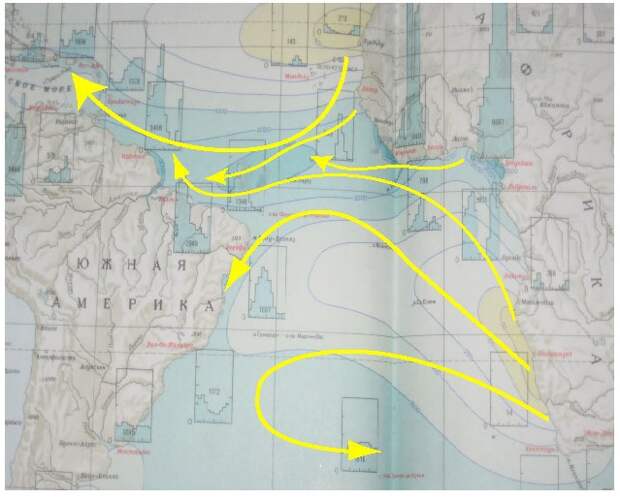 Самое быстрое в Атлантике течение над тектоническим разломом Ровшан могло донести суда до острова Фернандо-ди-Наронья, от которого до побережья Южной Америки всего 200 миль. Способствовать движению в этом направлении могли и местные западные ветра, дующие в сторону неизведанного континента. Македонцы были набожными людьми и, сбившись с курса, могли воспринимать западный ветер, дующий в их паруса, волей богов, которой они обязаны довериться.