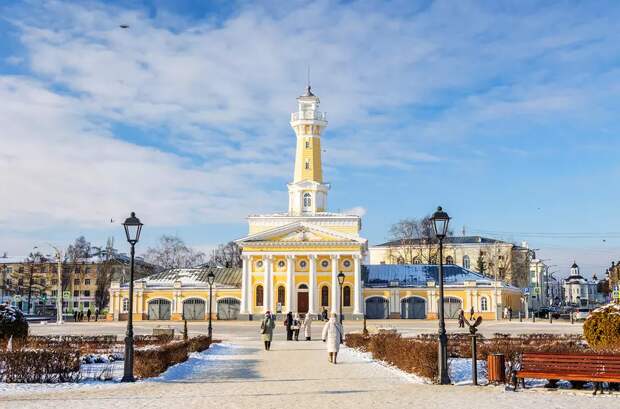 Главную площадь Костромы – Сусанинская. Здания, расположенные здесь, датируются концом XVII – началом XIX века и представляют собой памятники архитектуры в стиле классицизма. Не так давно закончилась их масштабная реставрация, и теперь вы можете увидеть яркую визитную карточку города – Пожарную каланчу - без строительных лесов.