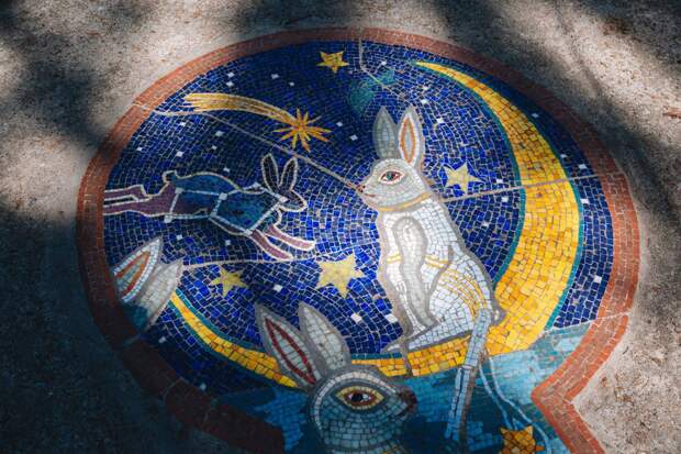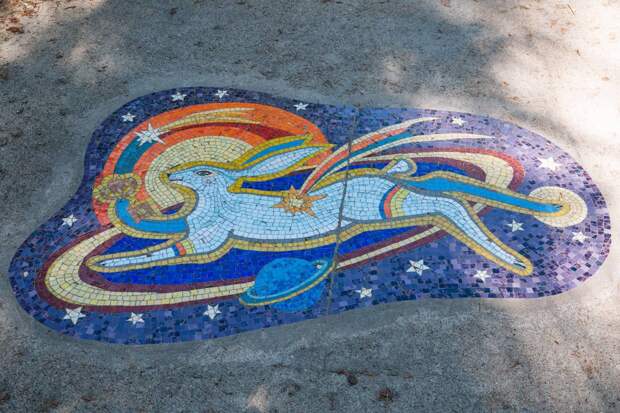 Серафима и Ксюша рассказали, что всего Светлоёжиков пока планируется двенадцать. А их мозаичных зайцев я, кстати, видел год назад.