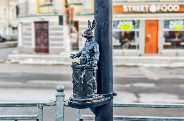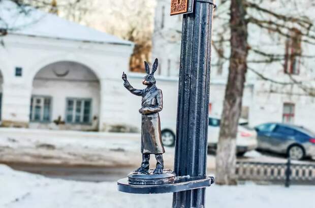Фигурка Заяца-Трактирщика установлена на столбе на пересечении улицы Чайковского и Советской улицы.Город на рубеже XIX – XX веков было невозможно представить без многочисленных чиновников, одетых в соответствующих рангу и ведомству мундиры. Поэтому в Костроме появился Заяц-Чиновник.