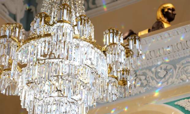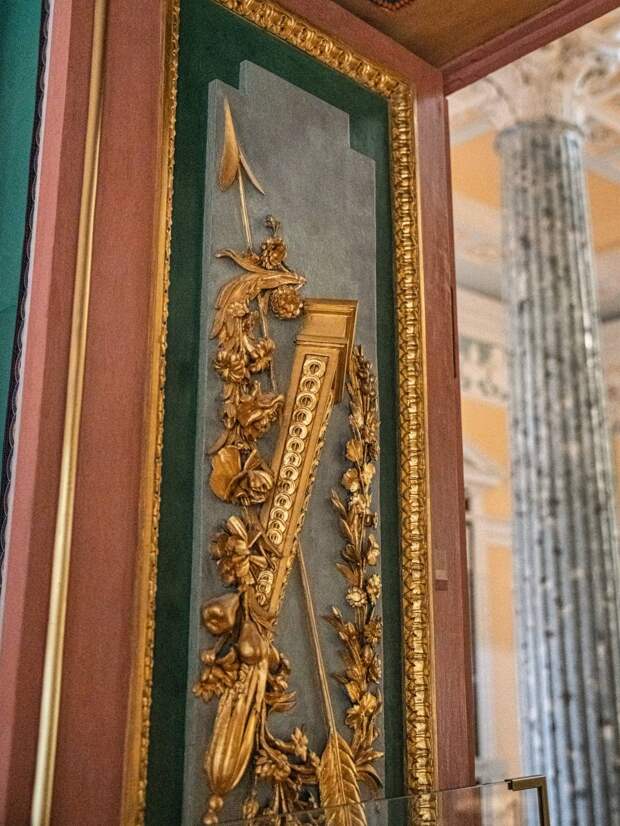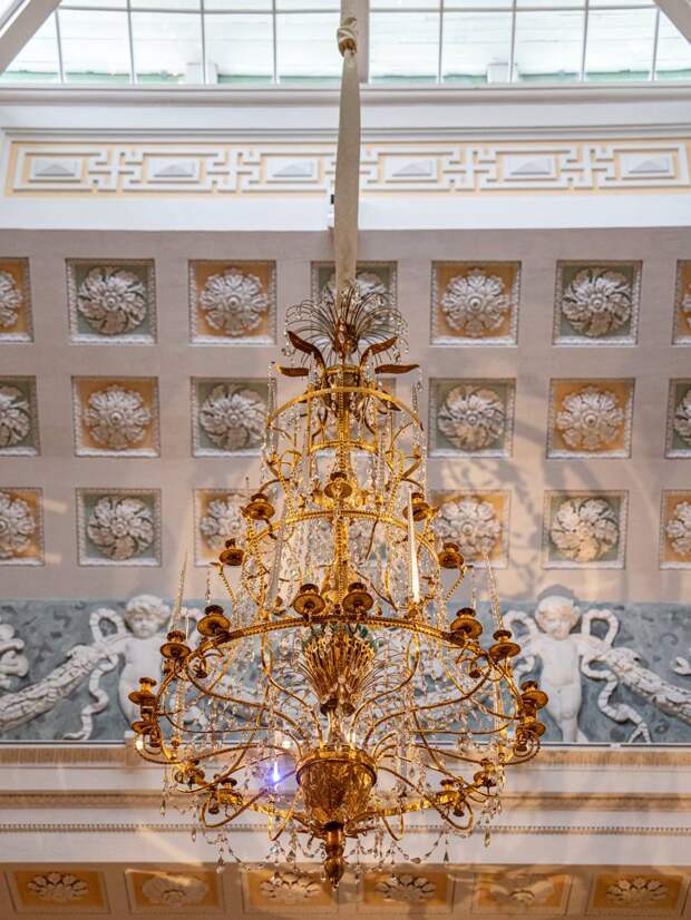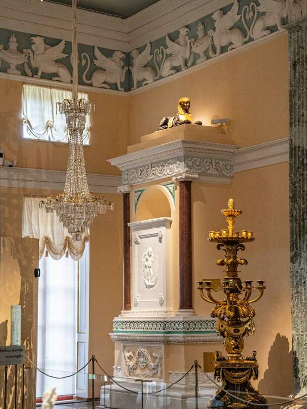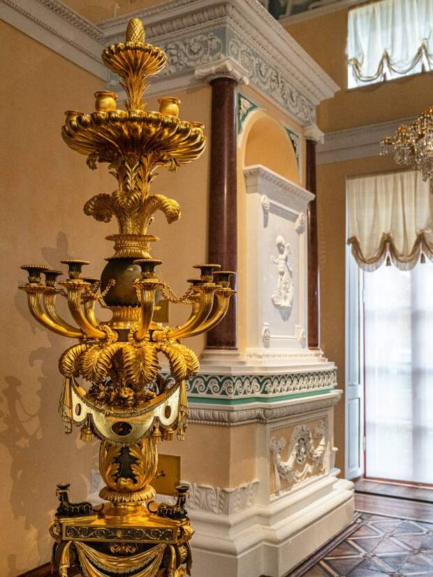 Здесь же располагаются золоченные торшеры и вазы-светильники, изготовленные в мастерской Павла Споля. Не менее прекрасны печи, украшенные колоннами и барельефами с ангелочками путти.
