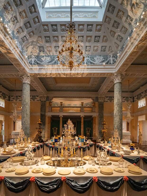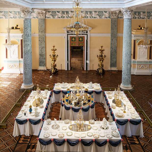 Выставка «В гостях у графа Шереметева». Воссозданная композиция из столов, зафиксированная на чертеже 1793 года «План парадной столовой в Египетском павильоне Останкинского дворца». Фото: ГМЗ «Останкино и Кусково»
