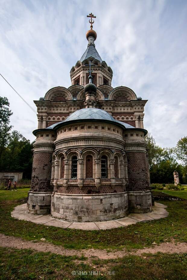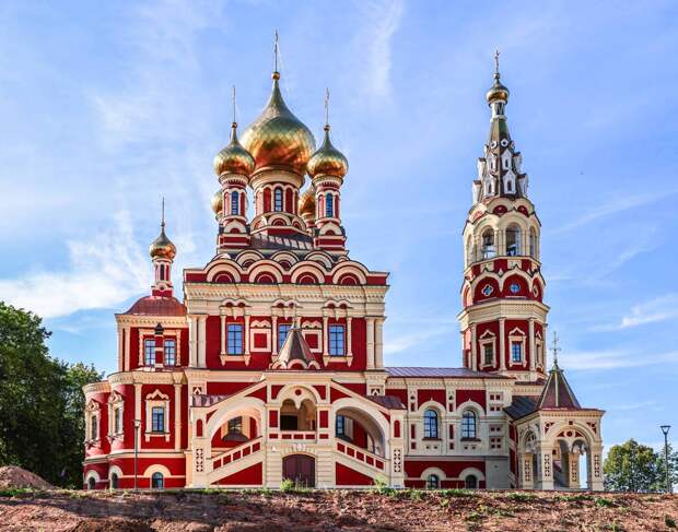 Храм был выстроен Н.Л. Бенуа в 1870-е годы, это русский стиль, а образцом стала церковь Троицы Живоначальной в Останкине (Москва, 17 век).