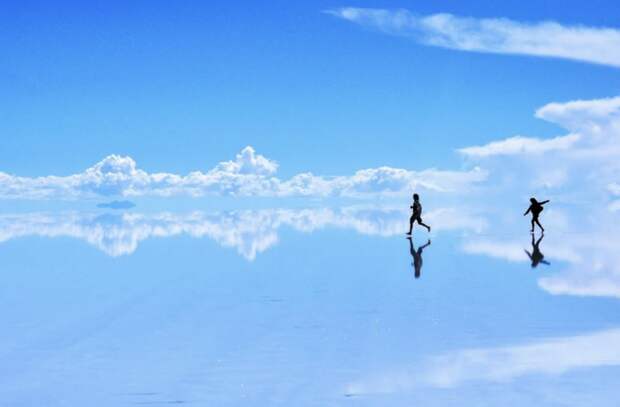 Солончак «Салар де Уюни», Боливия. В сезон дождей поверхность солончака превращается в гигантское зеркало, отражающее небо и создающее впечатление бесконечности.