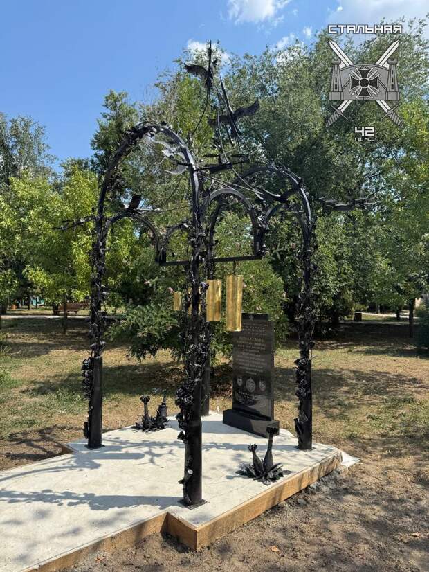 Этот уникальный кованый памятник создан руками нашего офицера с золотыми руками, горячим сердцем, необъятной русской душой, но со стальным позывным «КАРДАН», из осколков снарядов и гильз, собранных в зоне боевых действий.