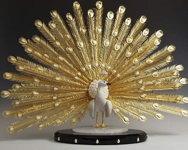 Белый павлин. Опал кахолонг, обсидиан, горный хрусталь, рубины, серебро; резьба, полировка, золочение. Размер 86,3 см.
