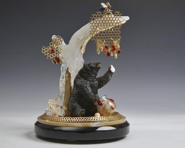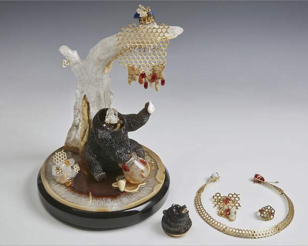 Ювелирный набор "Медведь и королева пчел" 2019 г. Обсидиан, горный хрусталь, агат, дымчатый кварц, ляпис-лазурь, рубины, сапфиры, изумруды, бриллианты, серебро; резьба, полировка, литье, золочение.