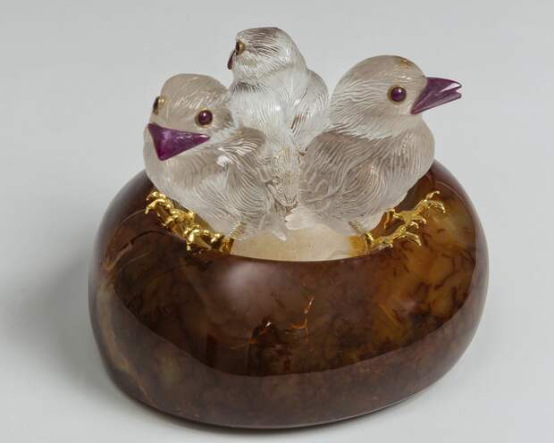 Птенцы зяблика в гнезде. Горный хрусталь, сердолик, рубины; резьба, полировка, литье. Диаметр 12,7 см.