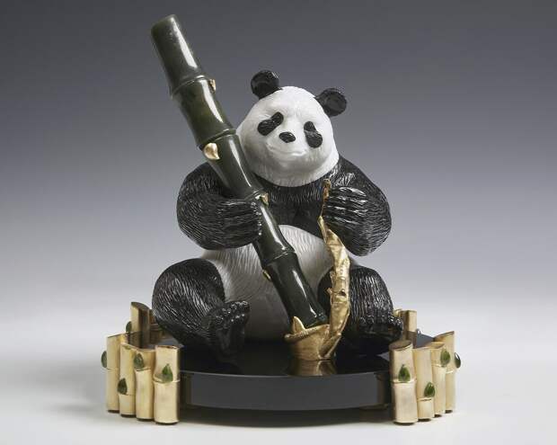 Панда с бамбуком - перьевой ручкой, 2019 г. Оникс, обсидиан, кальцит, нефрит, серебро; резьба, полировка, литье, золочение. Размер 20 х 20 х 27 см.