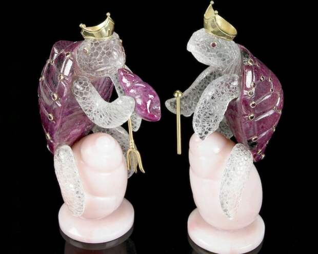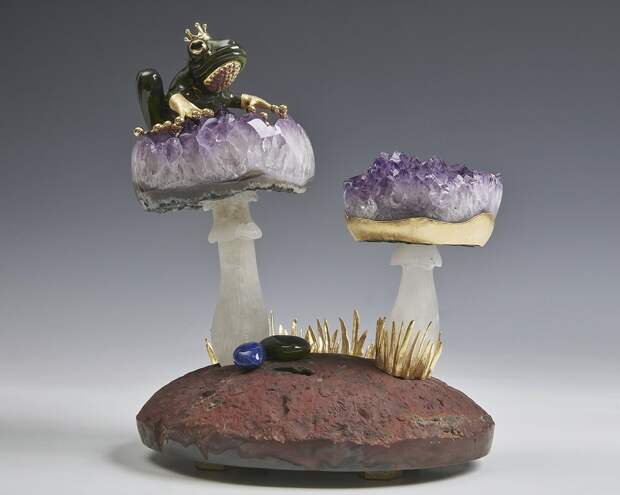 Ювелирный набор "Принц-Лягушка", 2019 г. Кварц, аметист, нефрит, бирюза, ляпис-лащурь, серпентин, серебро; резьба, полировка, литье, золочение.