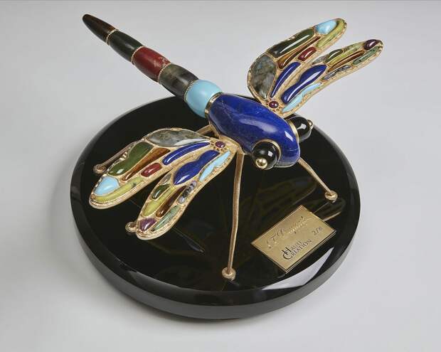 Стрекоза» с перьевой ручкой, 2019 г. Рубин, ляпис-лазурь, нефрит, тигровый глаз, индиго габбро, серпентин, красная яшма, бирюза, лабрадорит, обсидиан, серебро; резьба, полировка, литье, золочение. Размер 20 х 20 х 12 см.