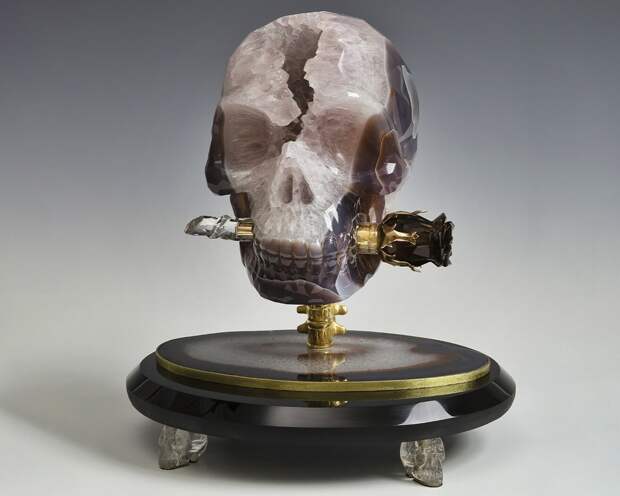 Череп вечности с перьевой ручкой. Агат, кварц, дымчатый кварц, обсидиан, серебро; резьба, полировка, литье, золочение.