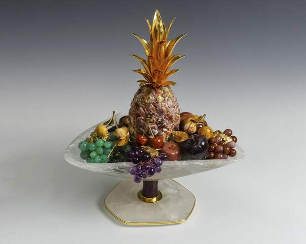 Ваза с фруктами ХХ в. Яшма, яшма мукаит, горный хрусталь, хризопраз, аметист, рубин, резьба, полировка, литье, золочение. Высота 43,8 см.