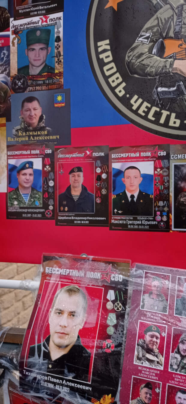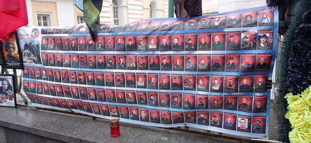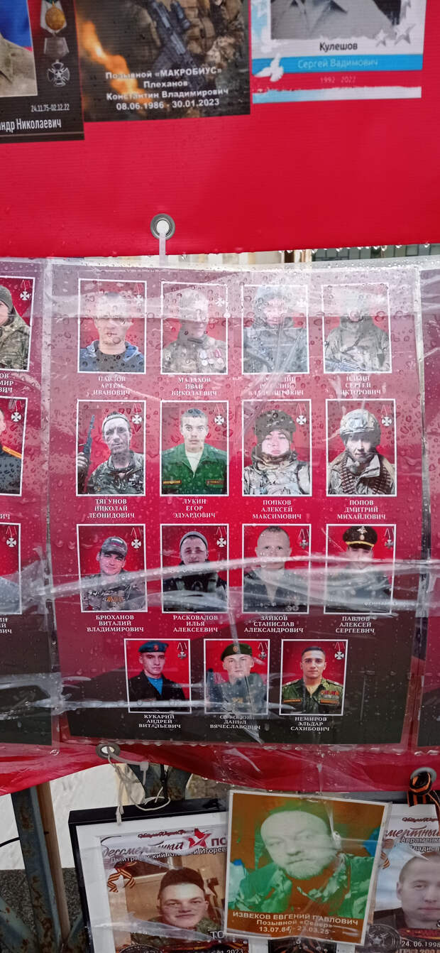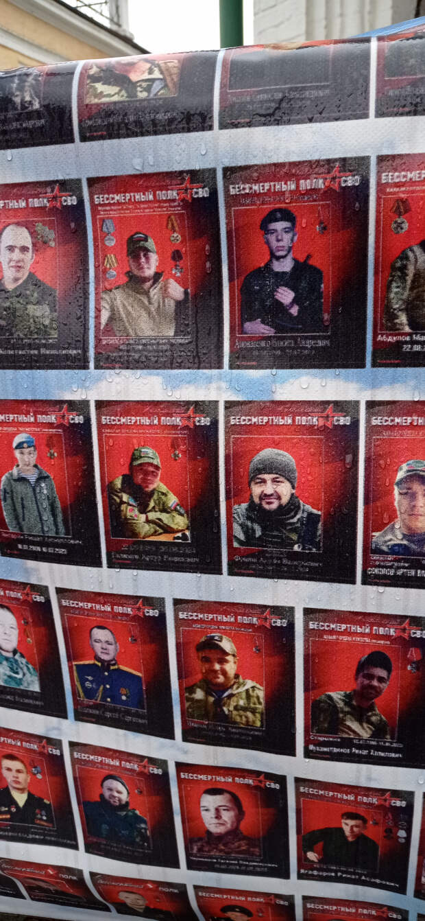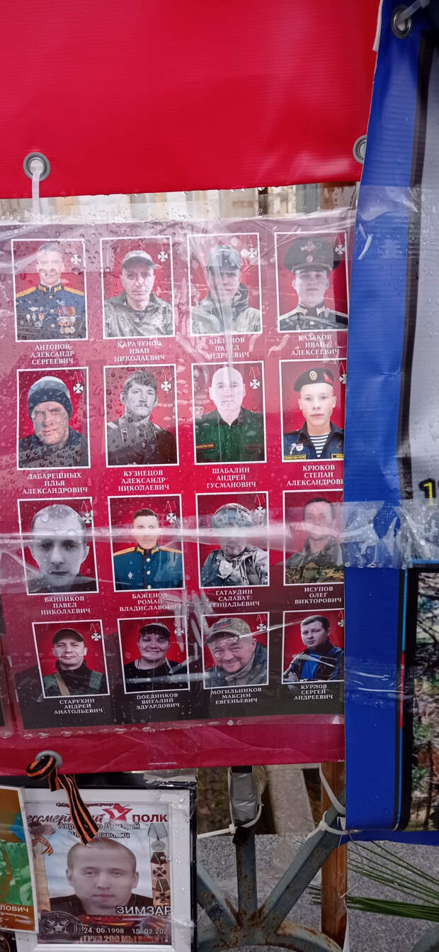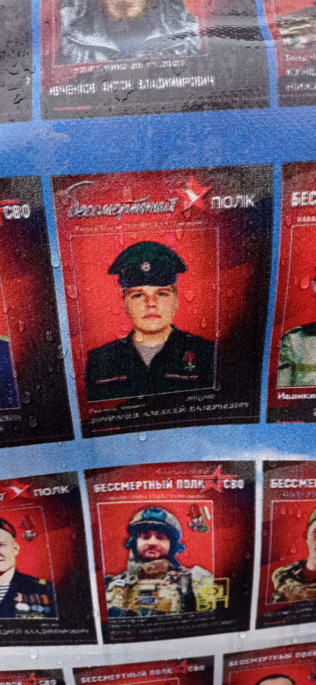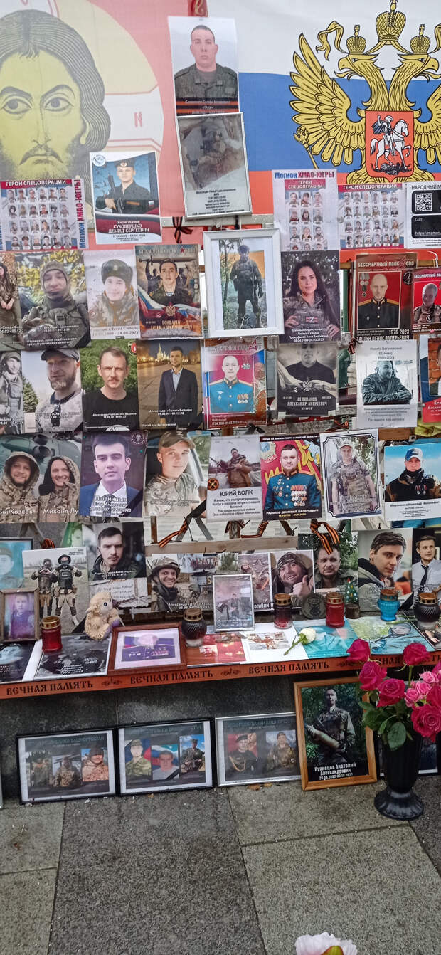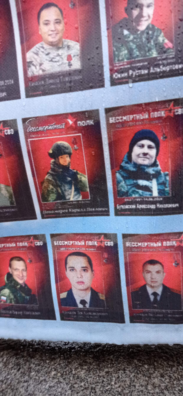 Раньше это не поместилось в предыдущие материалы. 26 ноября 2025 года (2 месяца назад) Я была по своим делам в центре Москвы. Когда я там бываю (не так уж и часто), я всегда стараюсь посетить так называемый "стихийный народный мемориал" наших Павших Воинов. Вот и в этот раз я там побывала. И нашла то, что меня очень порадовало (если вообще можно применить слово радость). Там появились 2 объекта (честно не знаю как назвать правильно), на которых напечатаны портреты работ Вадима Окладникова и портреты, которые были выполнены позднее, но в стиле работ Вадима. Вот их и хочу показать. Правда был дождь, отсюда и не очень хорошего качества снимки. Но как уж смогла. Зато могу с Вами поделиться.