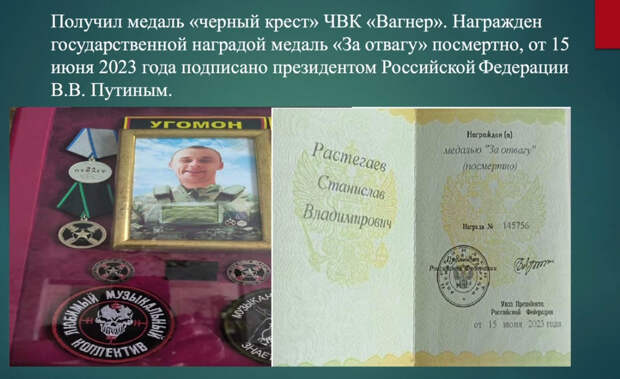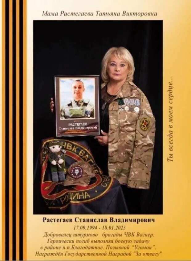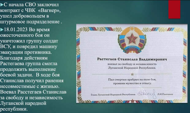 В рапорте сказано: «Растегаев Станислав Владимирович, 18.01.2023 года, находясь в группе резерва, осуществлял поддержку союзной штурмовой группы. После получения указаний, в составе группы, выдвинулся к вражеским позициям. При подходе к позициям врага, в районе н.п. Благодатное, группа попала в засаду. Во время ожесточённого боя Станислав уничтожил группу солдат ВСУ и повредил машину эвакуации противника. Благодаря действиям Растегаева, группа смогла продолжить выполнение боевой задачи. Сам Растегаев Станислав в ходе боя получил ранения, несовместимые с жизнью. Воевал Растегаев Станислав за свободу и независимость Луганской Народной Республики».