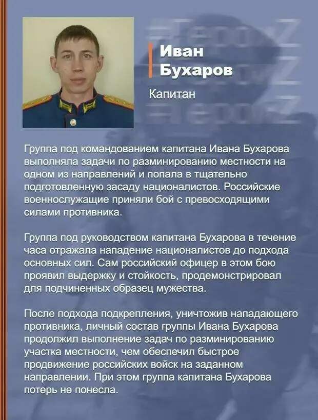 В ходе выполнения задачи по разминированию местности инженерно-штурмовая рота капитана Ивана Бухарова попала в засаду националистов. В результате российские военные отражали нападение превосходящих сил противника на протяжении часа, не понеся потерь. Затем к роте подошло подкрепление. Когда враг был уничтожен, военные продолжили разминирование.