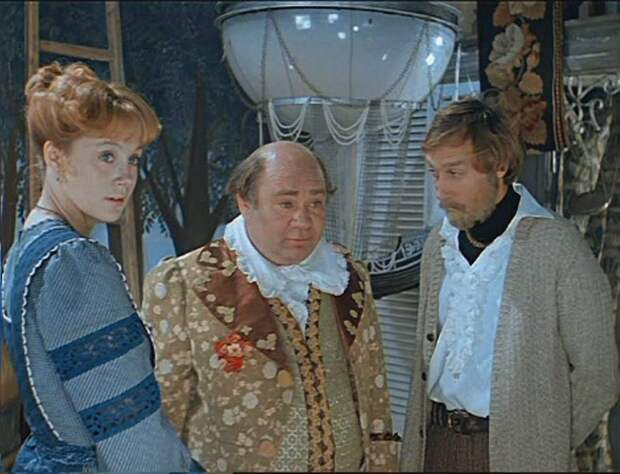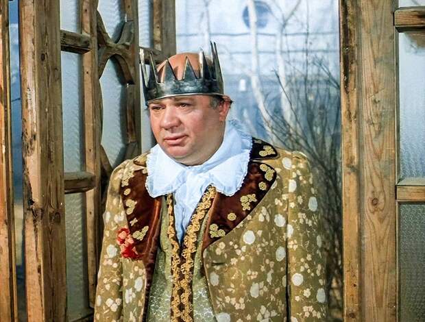 Кадр из фильма *Обыкновенное чудо*, 1978 После инфаркта снимался и Евгений Леонов, без которого режиссер также не представлял этого фильма. Роль Короля была, конечно, довольно необычна для Евгения Леонова, привыкшего играть добросердечных персонажей. Но актер сумел создать незабываемый тип тирана-обаяшки, сделав образ не только ироничным, но и трогательным. Нередко он импровизировал на площадке и предлагал свои версии тех или иных сцен. Чаще всего Захаров прислушивался к его советам, но однажды сделал по-своему и оказался прав. Марк Анатольевич говорил, что Евгению Павловичу удивительным образом удавалось чувствовать кадр – представлять, как тот или иной момент будет в итоге выглядеть на пленке. Леонов часто предлагал снять «актерский дубль», который в итоге на экране смотрелся выигрышнее режиссерского.