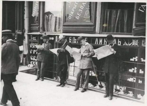 Горожане читают в газетах известие об объявлении войны. Санкт-Петербург, здание на углу Невского и Садовой. 20 июля 1914 года.