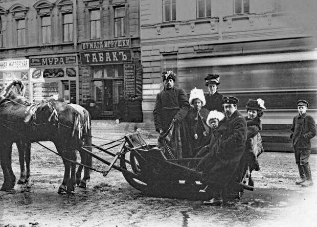 Люди на улице Петербурга. Видна паровая пекарня англичанина Мура. Начало ХХ века