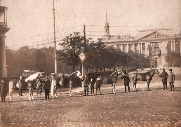 Демонстрация лошадей у западной кордегардии Инженерного замка, участники и их лошади с розетками и номерами, рядом высокая мачта, 1900–1905 гг. Видна мачта, которая, по одной версии, использовалась для поднятия флага, а по другой — могла быть радиовышкой. Такие мероприятия не только украшали городскую жизнь, но и подчеркивали значение конного спорта и традиций в дореволюционном Петербурге.