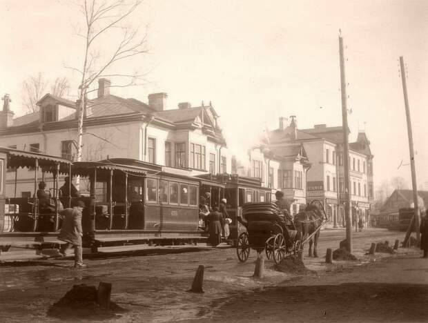 Встреча двух паровиков на 2-м Муринском проспекте у будущей площади Мужества. 1908–1914 гг.